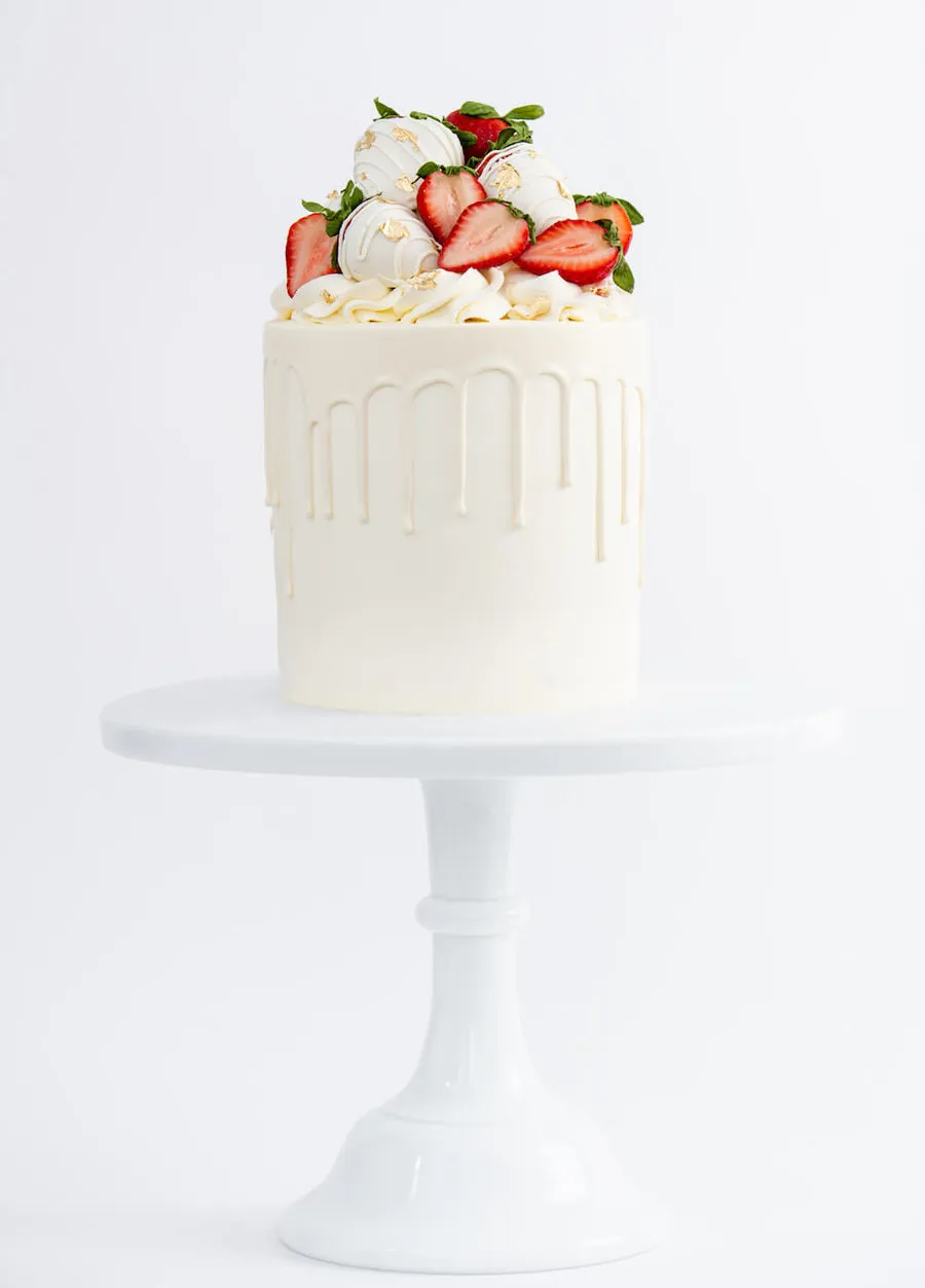 Fresh and sweet, fluffy and light! This delicious strawberry shortcake cake is layered with vanilla buttercream frosting, filled with fresh strawberries and topped with white chocolate-dipped strawberries with a touch of gold leaf for some extra fabulousness. Your tastebuds will be delighted in every bite! A feast for the eyes and tummy!